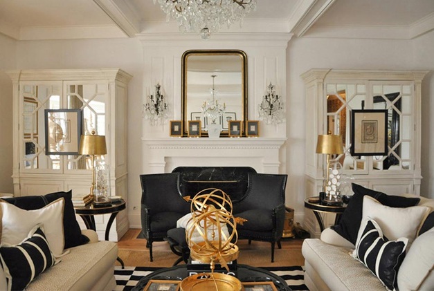 Когда в интерьере присутствуют предметы золотого или серебряного цветов, то такие предметы гармонично смотрятся, если они имеют компаньонов, цвет которых обязательно должен совпадать с их цветом. Например, к золоченой раме зеркала можно подобрать светильник с золочеными элементами или другие аксессуары.