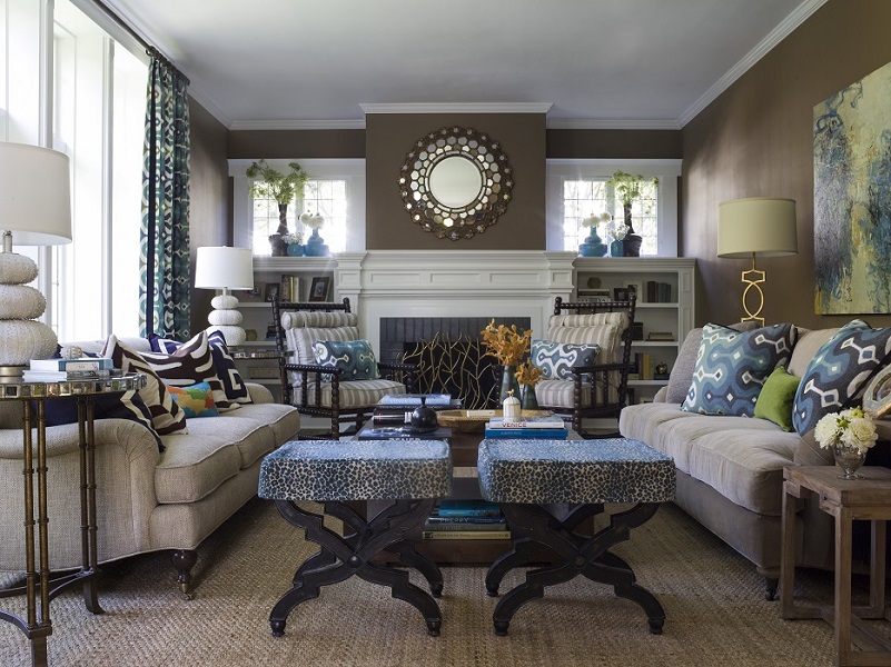 Например, цвет штор может сочетаться с цветом диванных подушек или обивкой мягкой мебели и стульев. Также декоративные предметы могут быть подобраны в тонах цветовой гаммы обоев. Или панно на стене может сочетать в себе разные цвета сразу нескольких элементов декора. При этом сочетающиеся между собой аксессуары должны быть равномерно распределены по всему помещению. Можно выбрать несколько сочетаний, например первое – обои на стенах и ковер на полу, второе – шторы, подушки и картина на стене. Это позволит избежать цветового зонирования пространства и сделать интерьер помещения целостным.